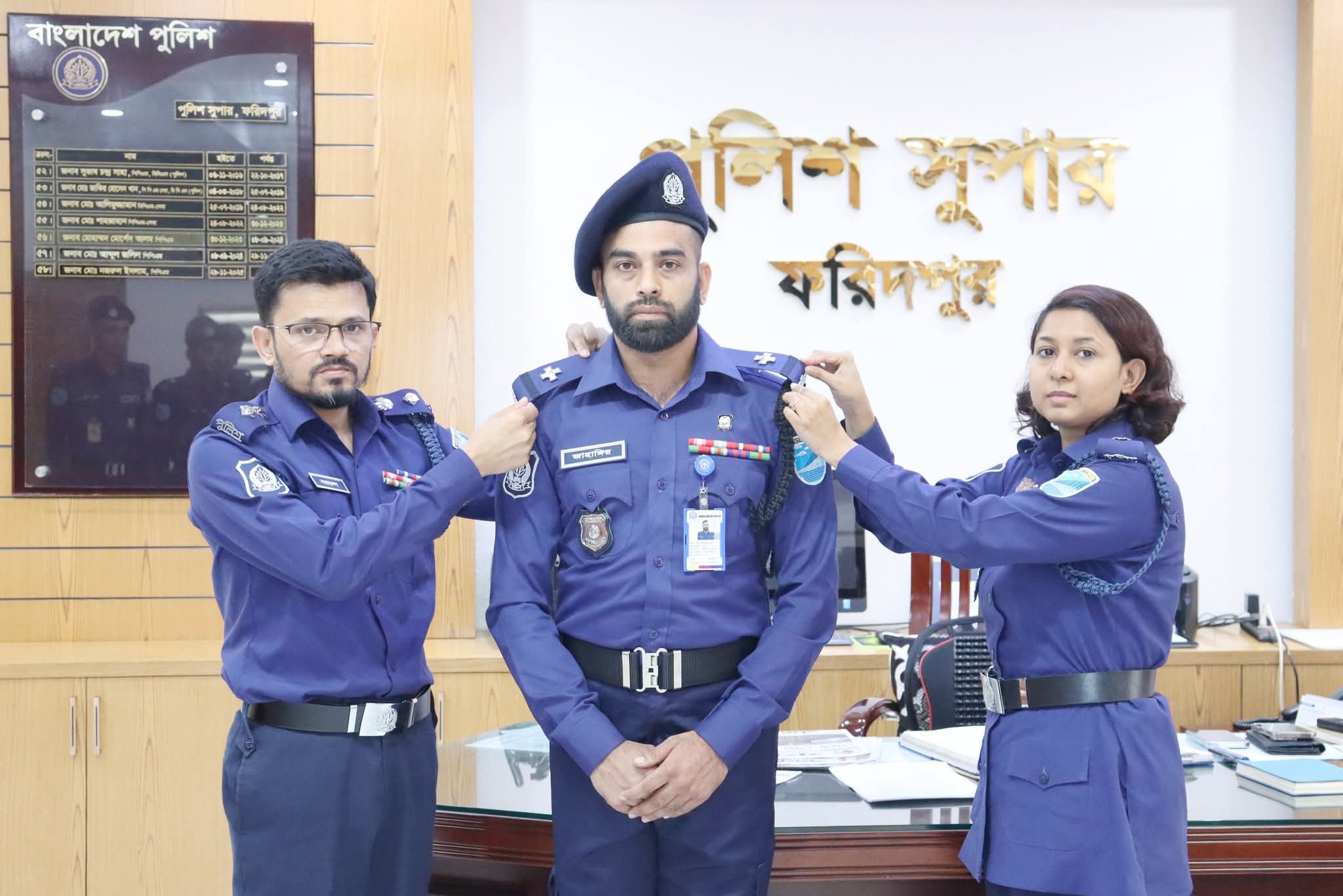 এএসআই(সশস্ত্র) ও নায়েক পদে পদোন্নতি প্রাপ্ত ০৩ জন পুলিশ অফিসারকে র‌্যাংক ব্যাজ পরিয়ে দিলেন পুলিশ সুপার, ফরিদপুর